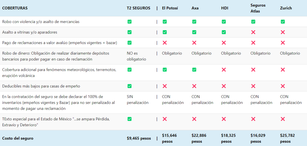 | Deducibles más bajos para casas de empeño | ✅ | | | ❌ | ❌ | ❌ | ❌ | ❌ |